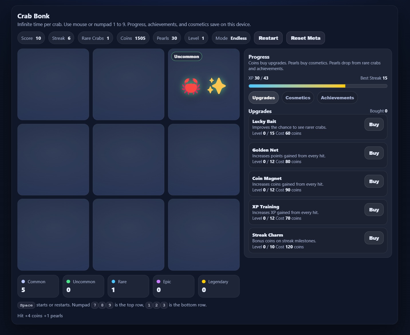 This progression game provides all of the excitement of hitting the crab in OSRS. It contains a meta progression system that will blow your mind as well as achievements and unlockable cosmetics.